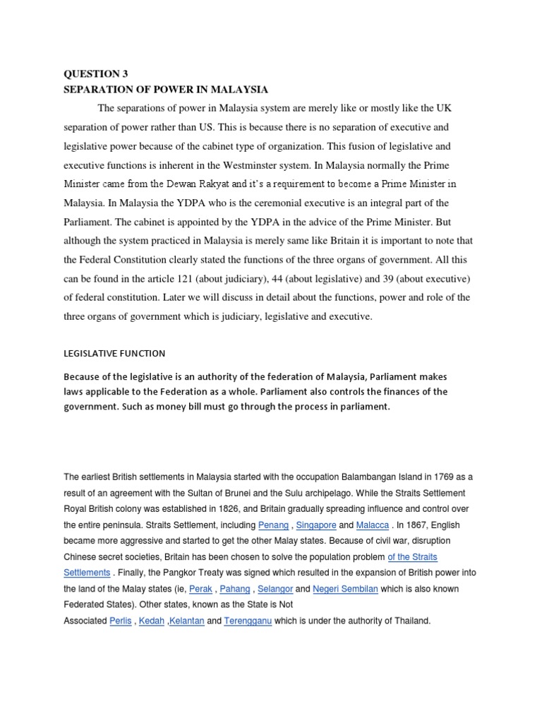 Malaysia follows liberal sense or under westminster system, which means there will be overlaps in function and membership between the legislature, the executive and the judiciary but on condition that there should be check and balance between the three organs. The structure of the constitution reflects the collective preferences of the state delegates who drafted it in 1787. Doctrine of separation of powers in malaysia is stipulated clearly in the article 121, 44, and 39, of federal constitution. The theory of separation of powers has been attacked on the following grounds. New face of separation of powers: