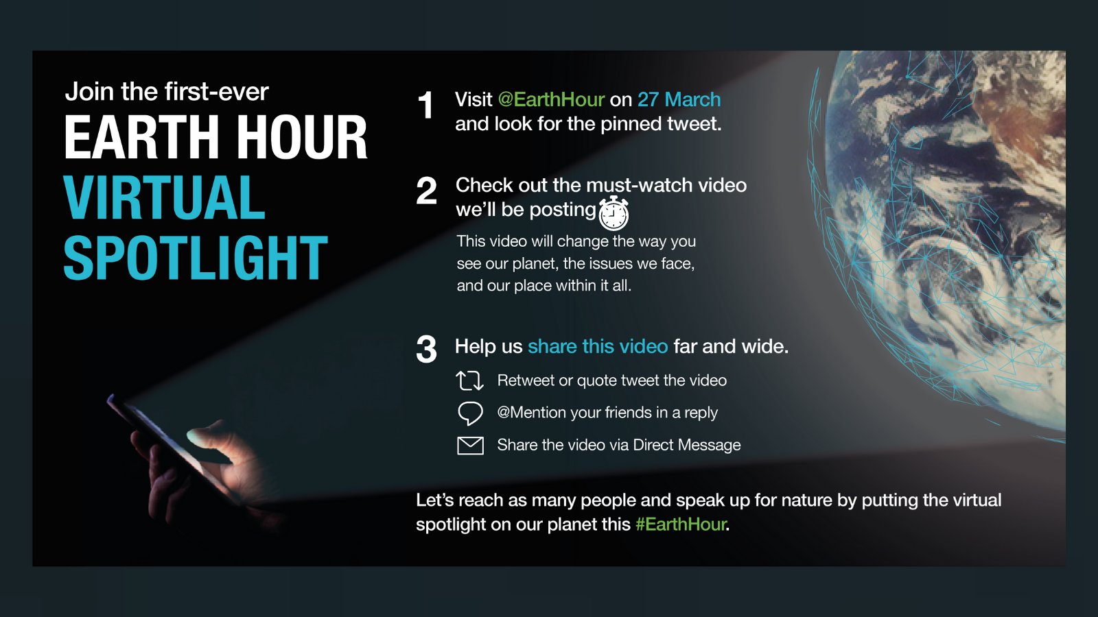 Earth Hour 2020 Goes Digital In Solidarity With People And The Planet Wwf from wwfint.awsassets.panda.org Earth hour is organised by the world wide fund for nature (wwf). Earth hour is a very effective way to spread awareness about climate change and what we can do about it. Earth hour is a global movement which takes place on the last saturday of every march. What began in 2007 as one city's dramatic stand against global warming has become a global movement. Millions of people around the world switch off their lights to show they care about the with our footprint calculator, you can find out what impact your lifestyle has on our planet. Every year millions of us take part in earth hour. It is an excellent way to feel good about doing something for the environment when you're actually not. Earth hour 2021 is a global event celebrated to save natural resources.